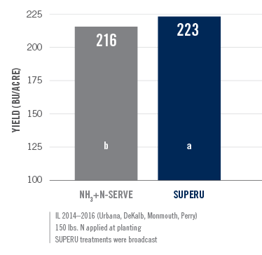 In a study conducted by the University of Illinois on corn fields averaged across 10 site years, SUPERU resulted in a yield advantage of 7 bu/acre compared to anhydrous ammonia treated with N-Serve®.