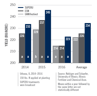 In two other studies conducted by the University of Illinois in Urbana from 2014-2016, researchers compared SUPERU fertilizer to ESN® and UAN treated with Instinct®. Application of SUPERU fertilizer, when averaged across three years, resulted in a yield advantage of 8 bu/acre over ESN. When average across two years, the yield advantage of SUPERU fertilizer over UAN treated with Instinct® was 12 bu/acre.