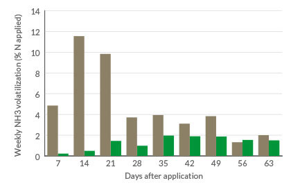Research by Agriculture and Agri-Food Canada showed that when untreated urea was placed in bands two inches below the surface, nitrogen loss due to ammonia volatilization was more than 25% (Figure 1). Additional moisture below the soil caused the incorporated urea to dissolve and hydrolyze quicker, releasing more ammonia gas.
