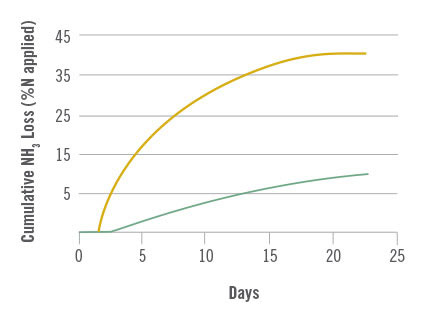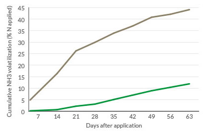 Fortunately, that same study also showed AGROTAIN® nitrogen stabilizer protects against this cold weather loss. At one location, untreated urea lost about 44% of its nitrogen through ammonia volatilization after nine weeks (63 days) while urea treated with AGROTAIN® stabilizer only lost about 12%.