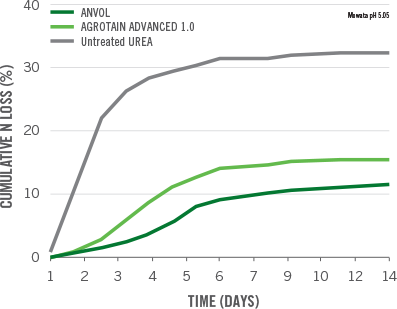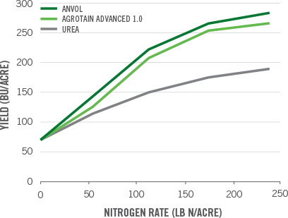 Studies conducted with urea treated with ANVOL stabilizer showed it outperforms urea treated with AGROTAIN®. At Virginia Tech, researchers found urea treated with ANVOL stabilizer increased corn yield by 11 bu/acre in comparison to urea treated with AGROTAIN. A 2016 rice trial at Louisiana State University showed that volatilization was more than 30% without a urease inhibitor. In this study, ANVOL stabilizer outperformed AGROTAIN-treated urea by an additional 26%.